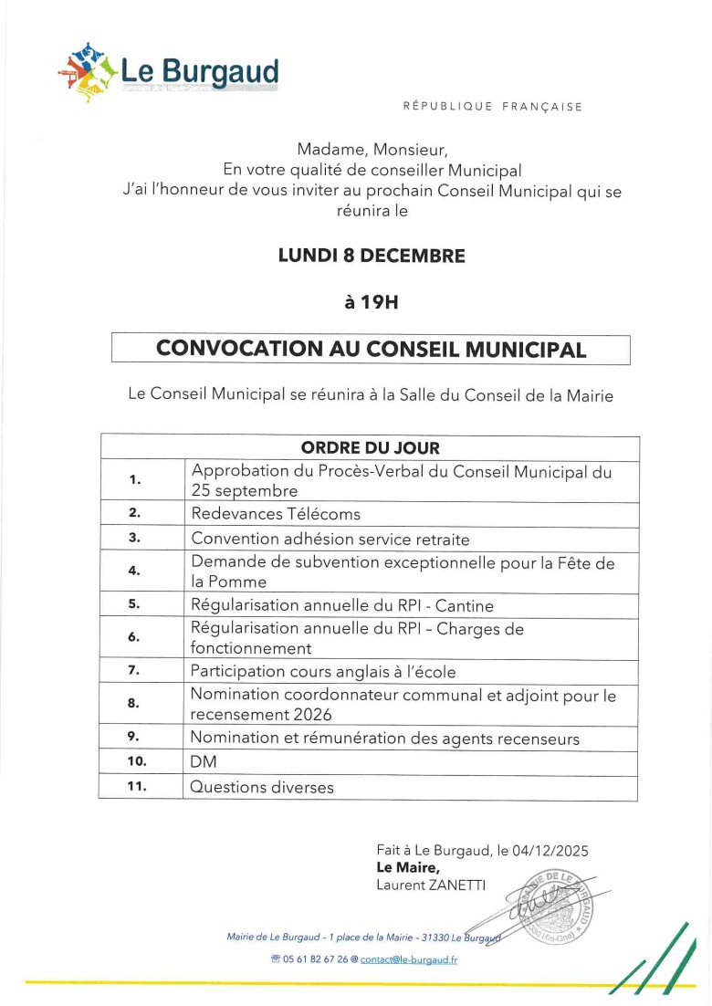 Ordre du jour du conseil municipal du 8 décembre 2025